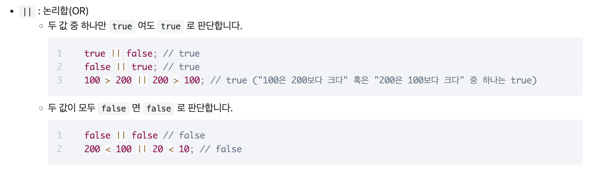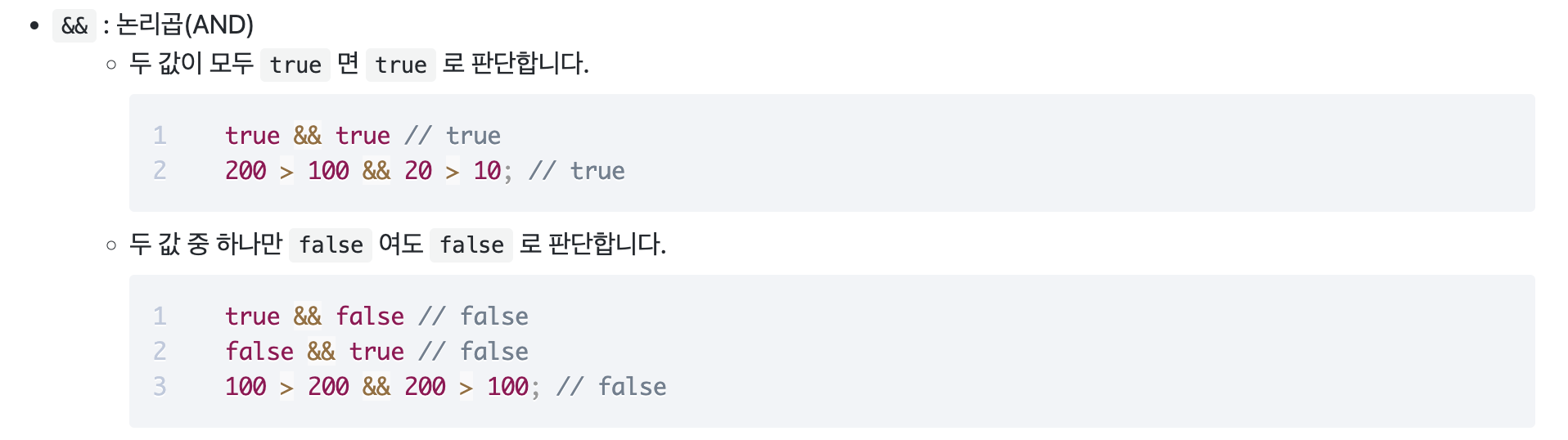 논리연산자(logical operator)로 두 값 간의 논리 관계를 확인할 수 있습니다.