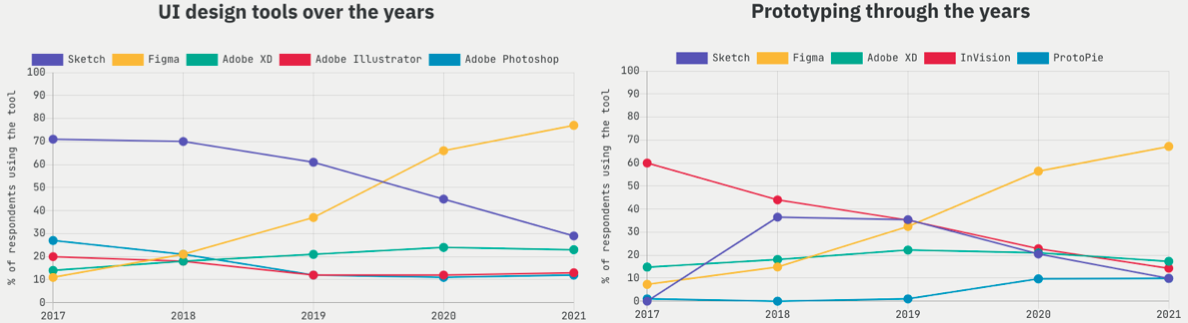 Figma는 2016년 9월에 출시된 UI 디자인 & 프로토타이밍 툴로, 출시 이후로 꾸준히 점유율을 높여가다가 지금은 UI/UX 업계에서 가장 인기 있는 툴이 되었다.