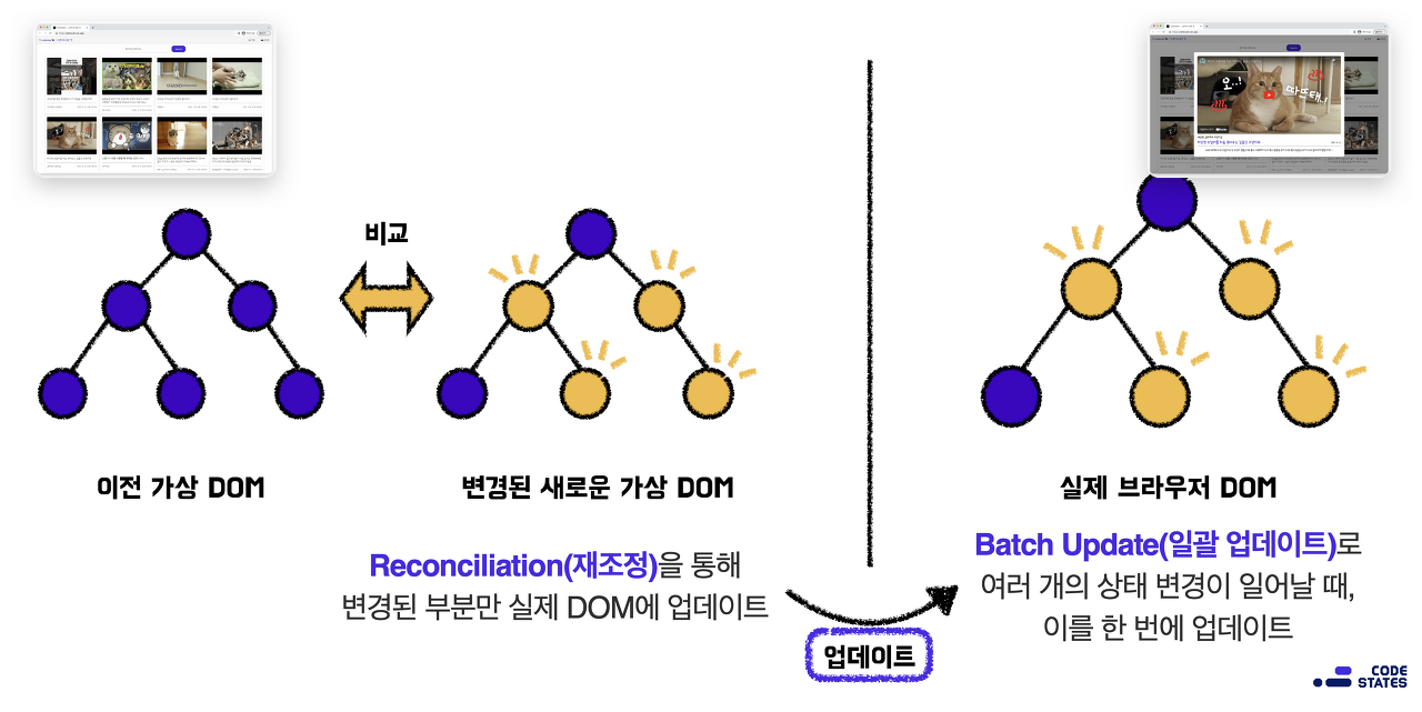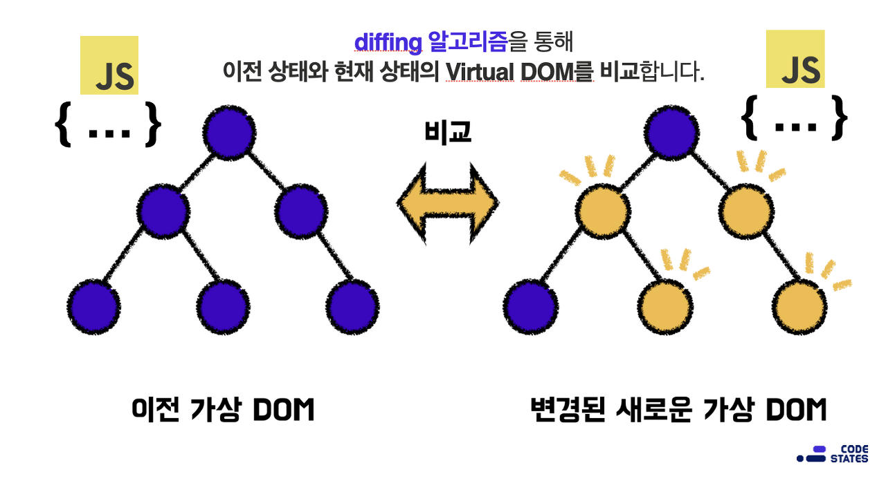 리액트는 상태를 변경하는 작업(e.g. 이벤트)이 일어났을 때, 가상 DOM 에 저장된 이전 상태와 변경된 현재 상태를 비교한다.